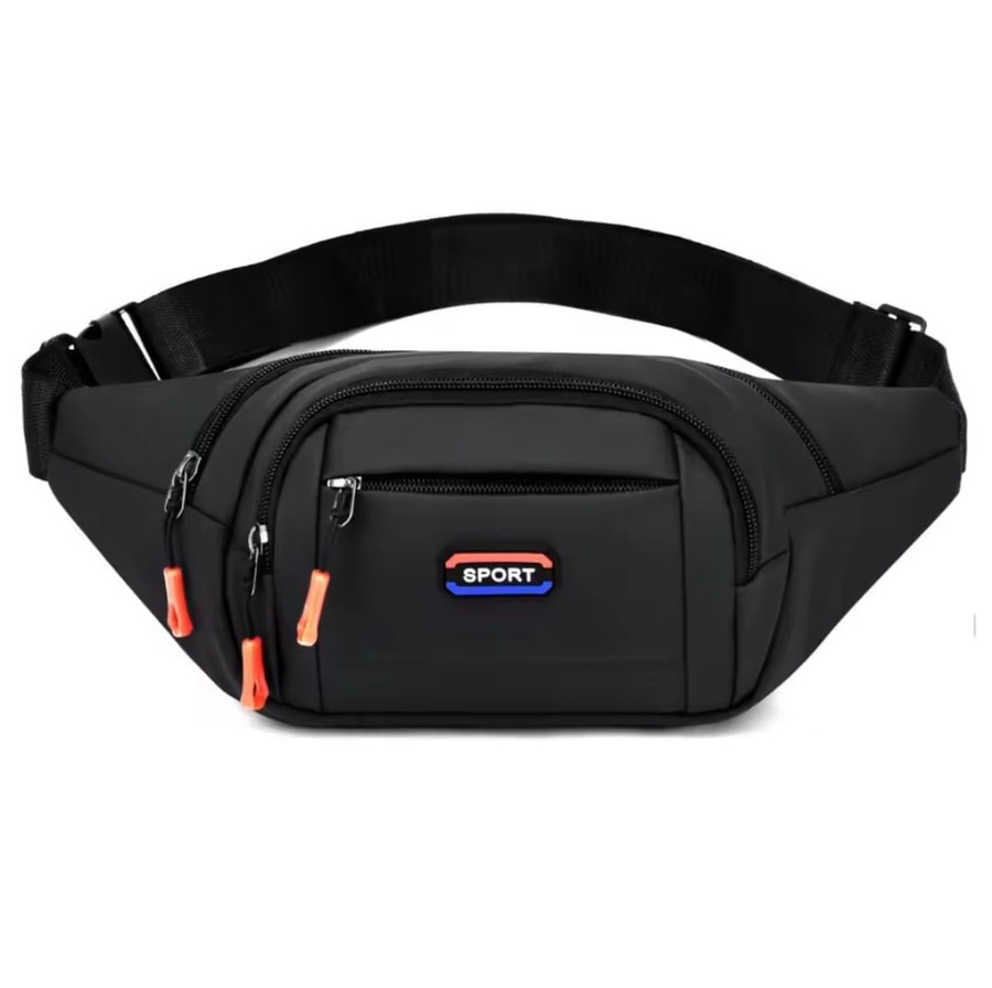شنطة وسط رياضية سوداء متعددة الجيوب. خامة ووتر بروف عالية الجودة وتصميم عصري. مثالية للجيم، الجري، والسفر لحفظ الموبايل والفلوس بأمان. اطلبها الآن