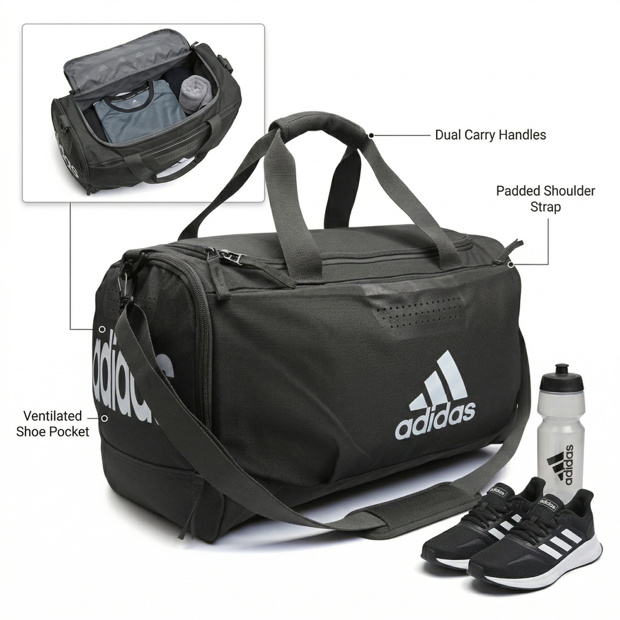 - سعة تخزين ممتازة: بأبعاد مثالية (طول 49 سم × ارتفاع 28 سم × عرض 25 سم)، تتسع الشنطة بكل سهولة للملابس الرياضية، المناشف، أدوات الاستحمام، وزجاجة المياه.