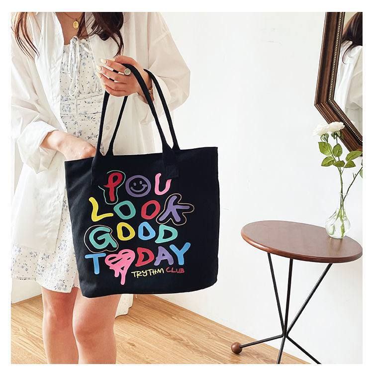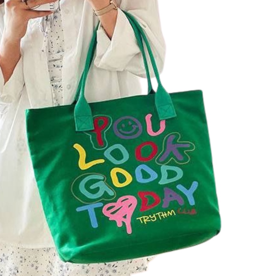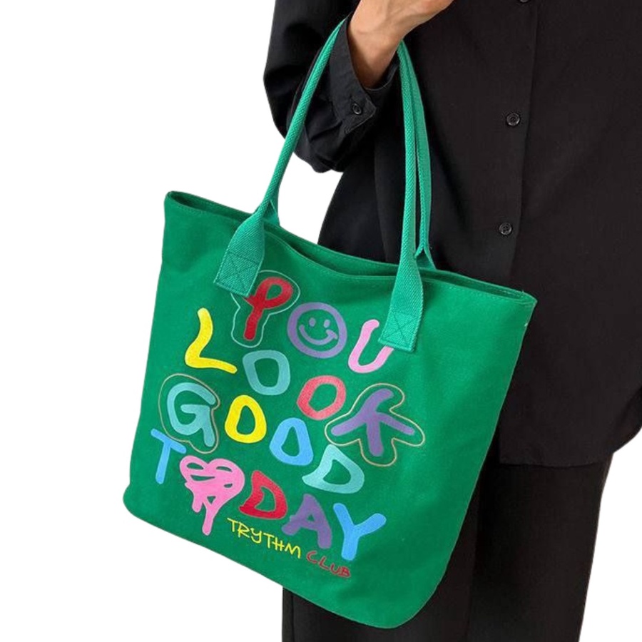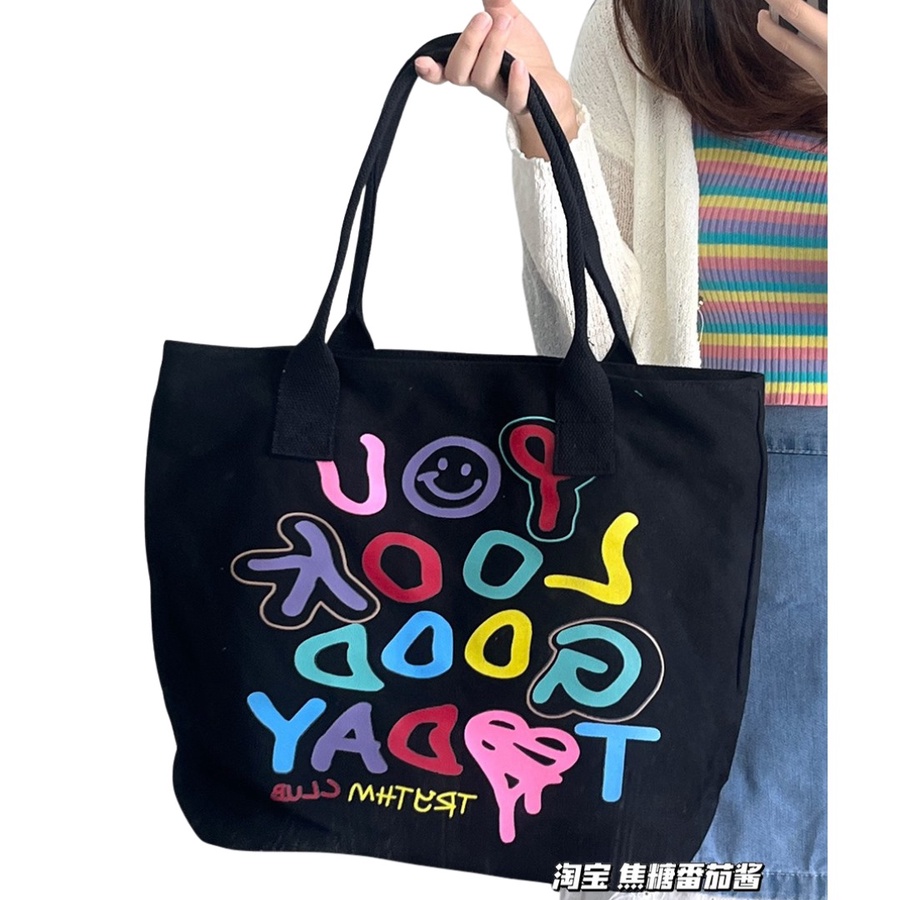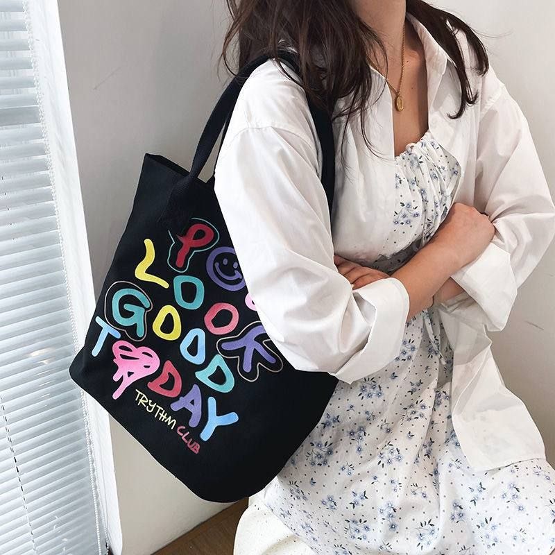 شنطة الكتف القماش دي مناسبة للبنات اللي بتحب الستايل الكاجوال المرح، مطبوعة لطيفة تخلي شكلها مميز وتدي لوك مختلف مع أي طقم بسيط. مساحتها واسعة تشيل نوت بوك، كتاب، تابلت خفيف، المحفظة، الموبايل وكام قطعة ميكب، فتنفع قوي للجامعة، الدروس أو الخروجات مع الصحاب.