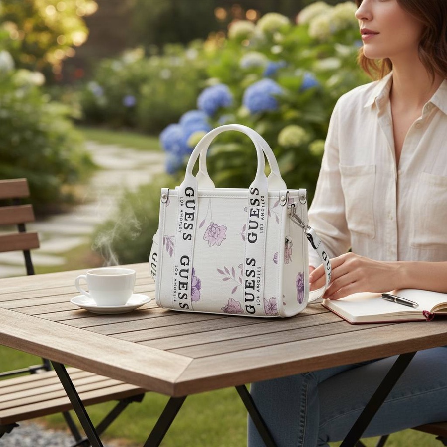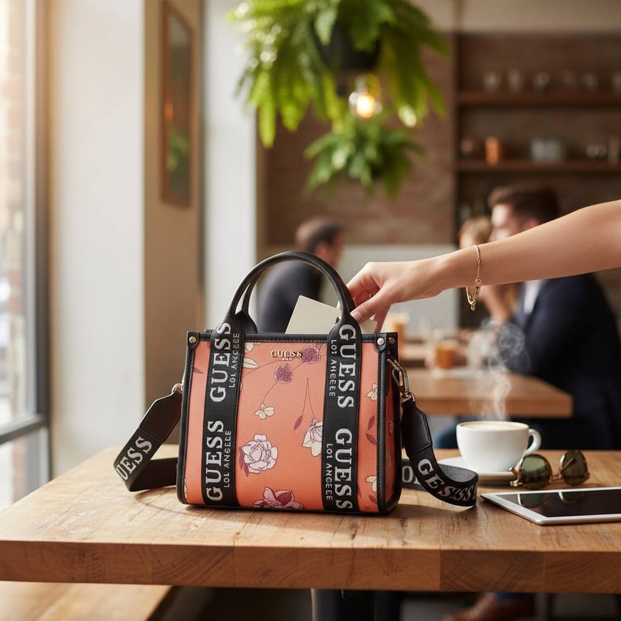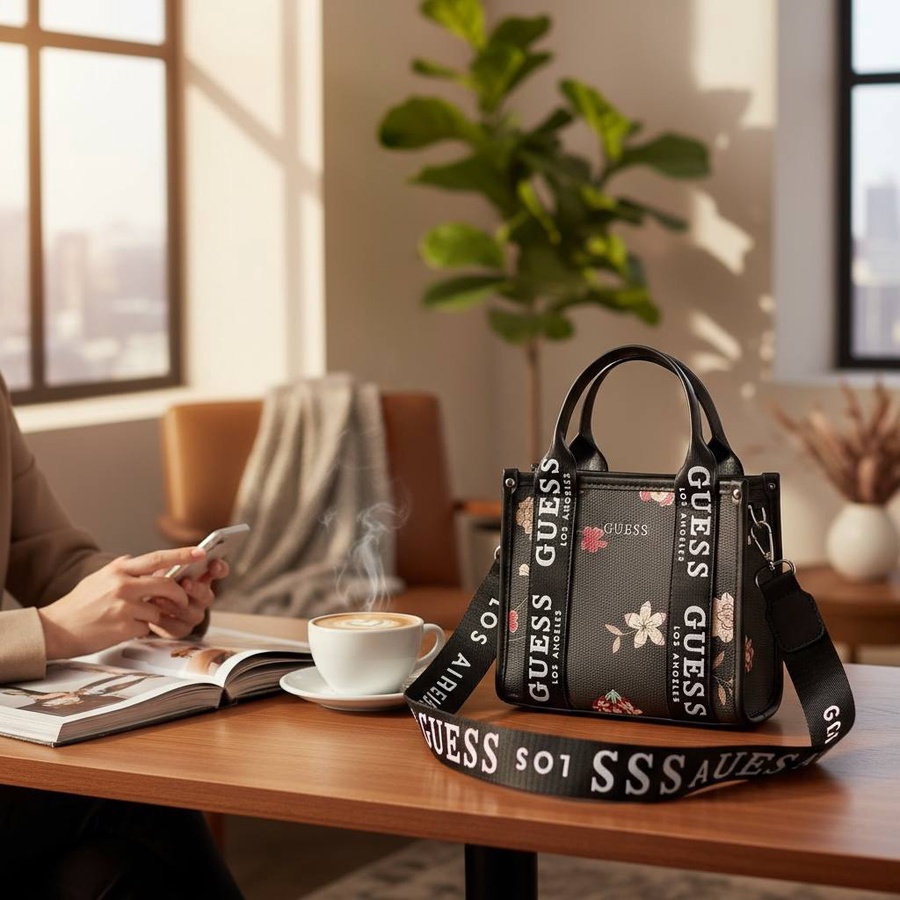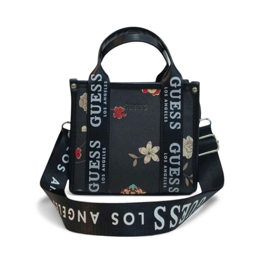 شنطة الكروس الحريمي من Guess شكلها مختلف وعصري، تصميم مربّع مع يد علوية وحزام عريض مكتوب عليه الشعار يخلي الشنطة ملفتة جداً في أي لوك كاجوال أو سبور.