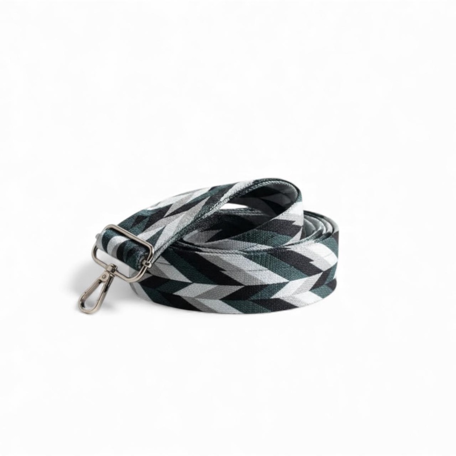 حزام شنطة قماشي بتصميم أنيق بألوان رمادي، أسود، وأخضر غامق مزود بمشبك معدني قوي في الطرفين قابل للتعديل ليناسب الشنط الكروس والكتف، ويغير شكل شنطتك في ثواني